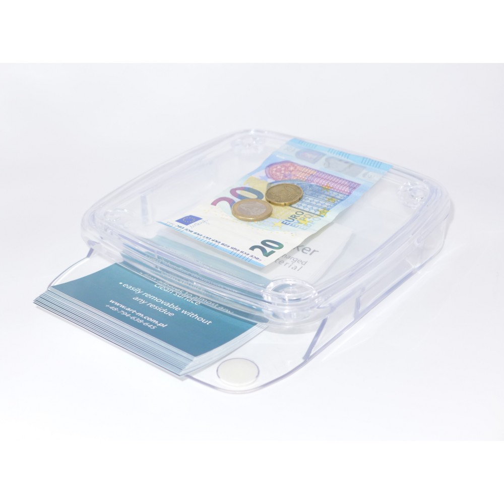 und ist aus einem harten transparenten Kunststoff hergestellt. Der Werbeträger für diese Ausführung ist ein Papiereinleger (Kreidepapier 130-150 g/m2). Sie können den Werbeeinleger bei uns bestellen.
